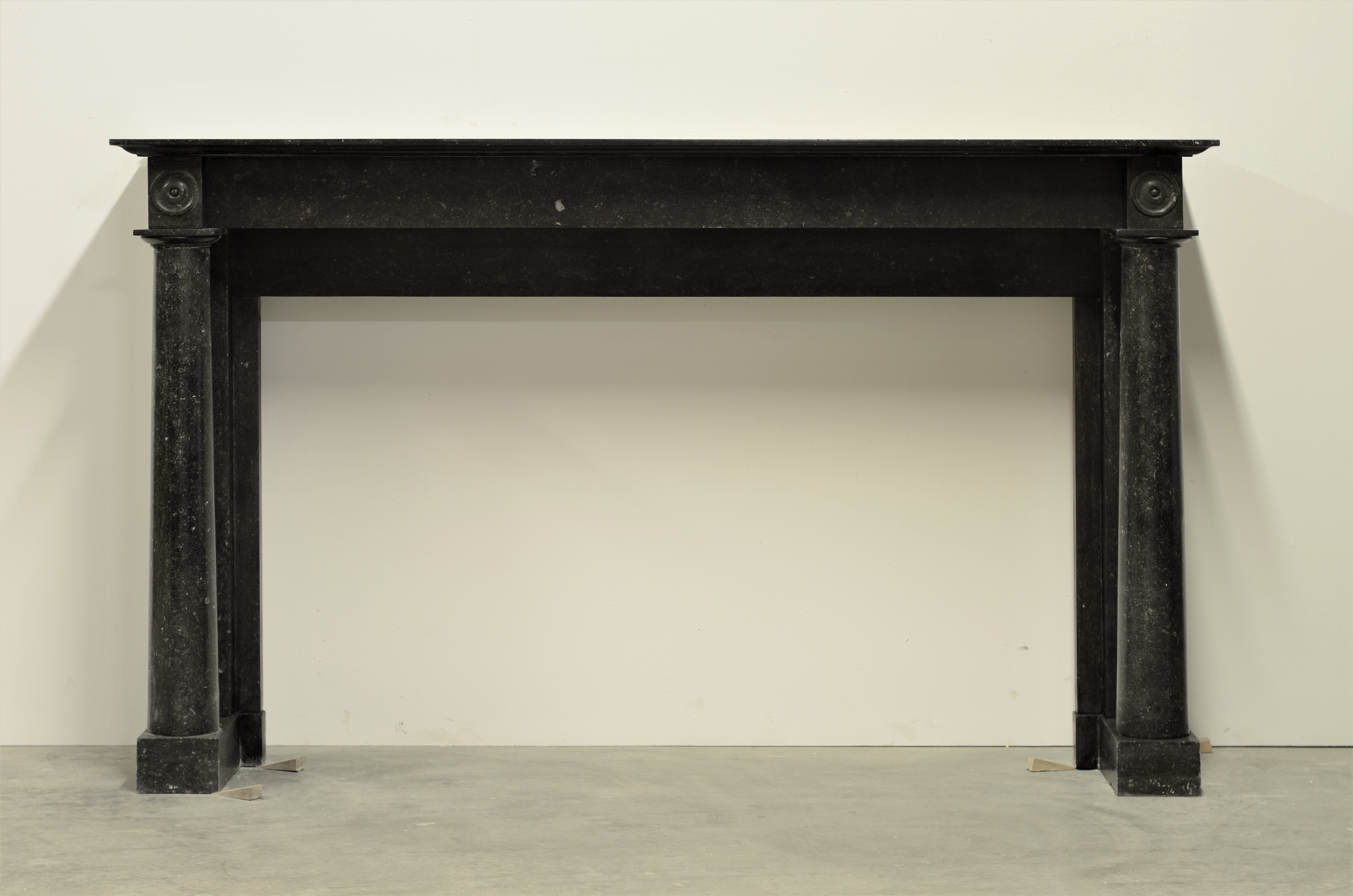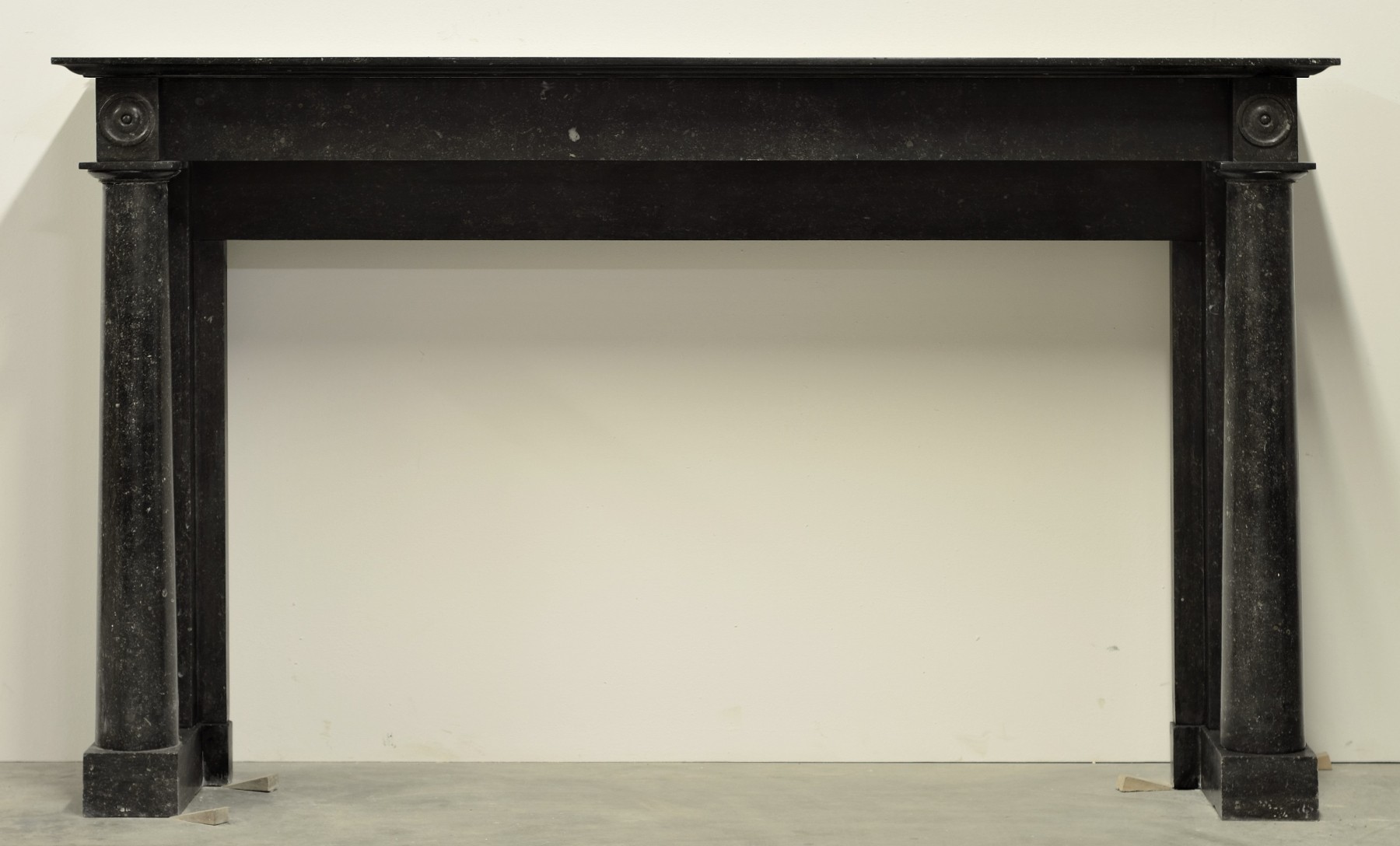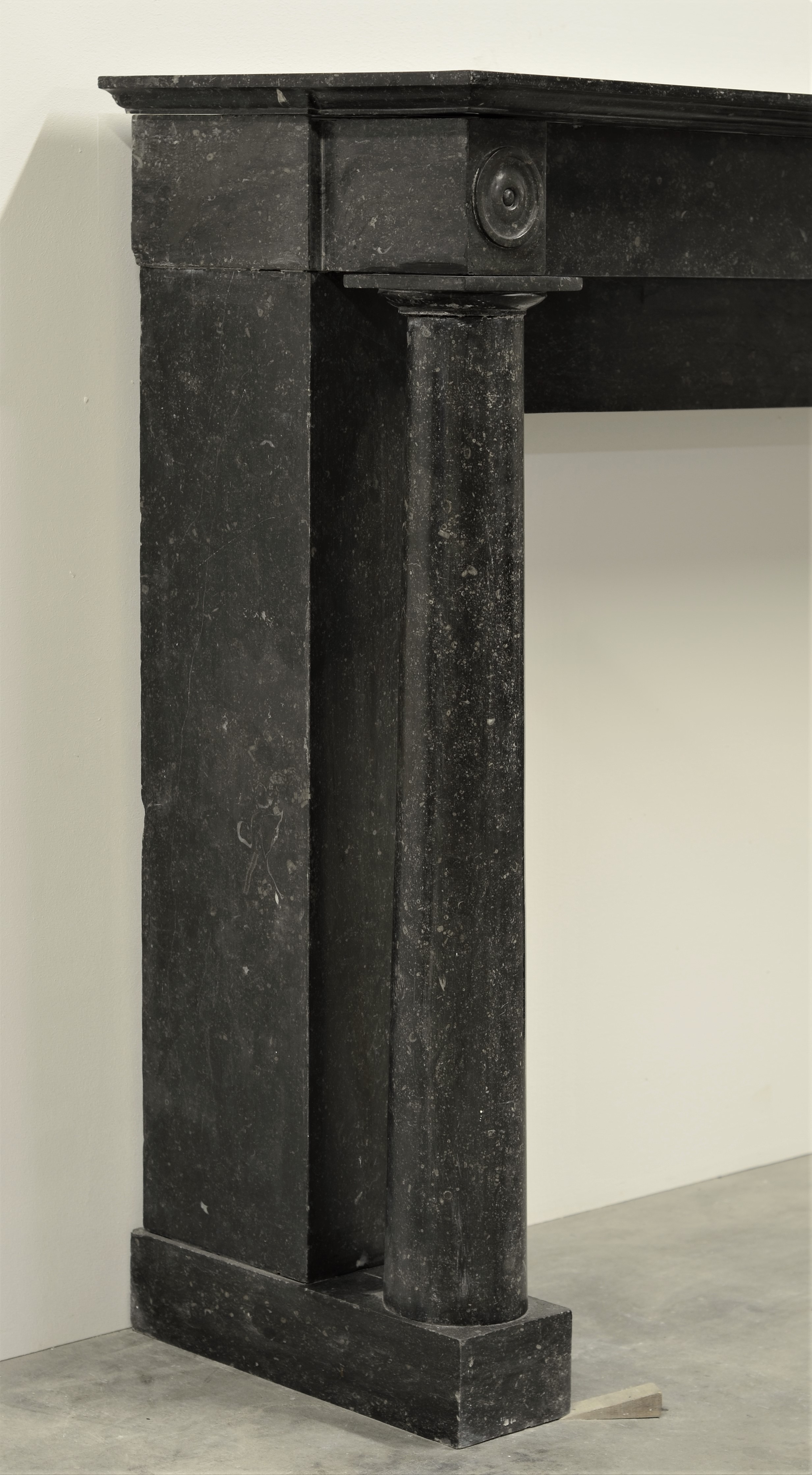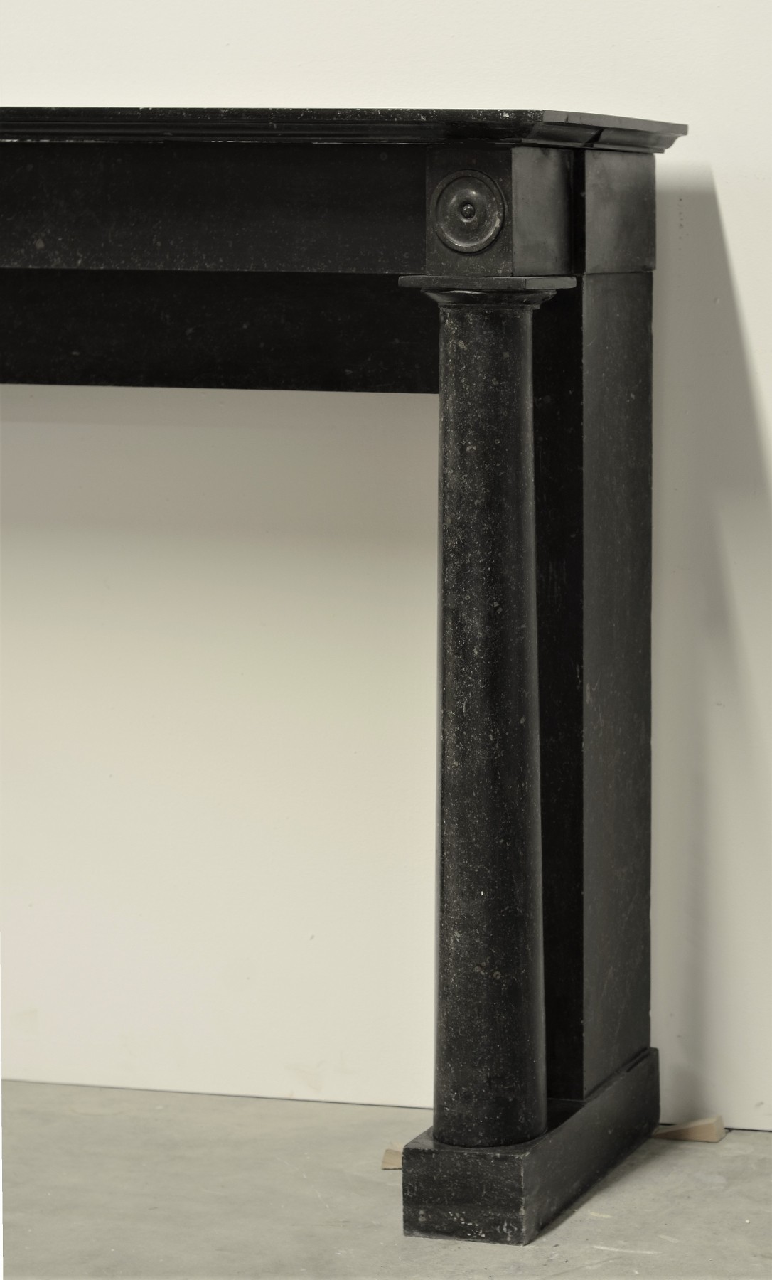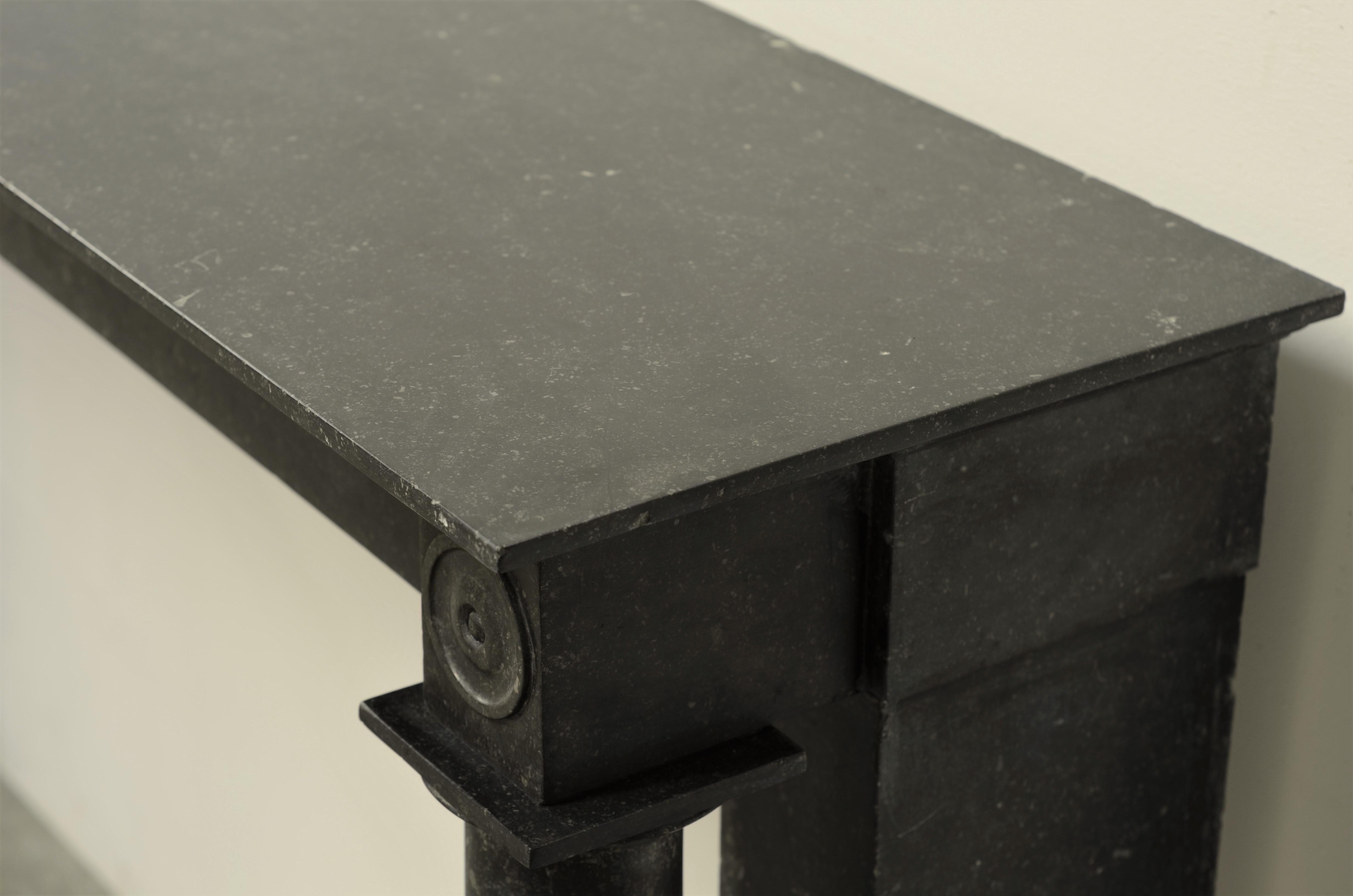 A nice and wide Empire style fireplace mantel executed in Belgian blue stone. Paris region, France, 19th century.