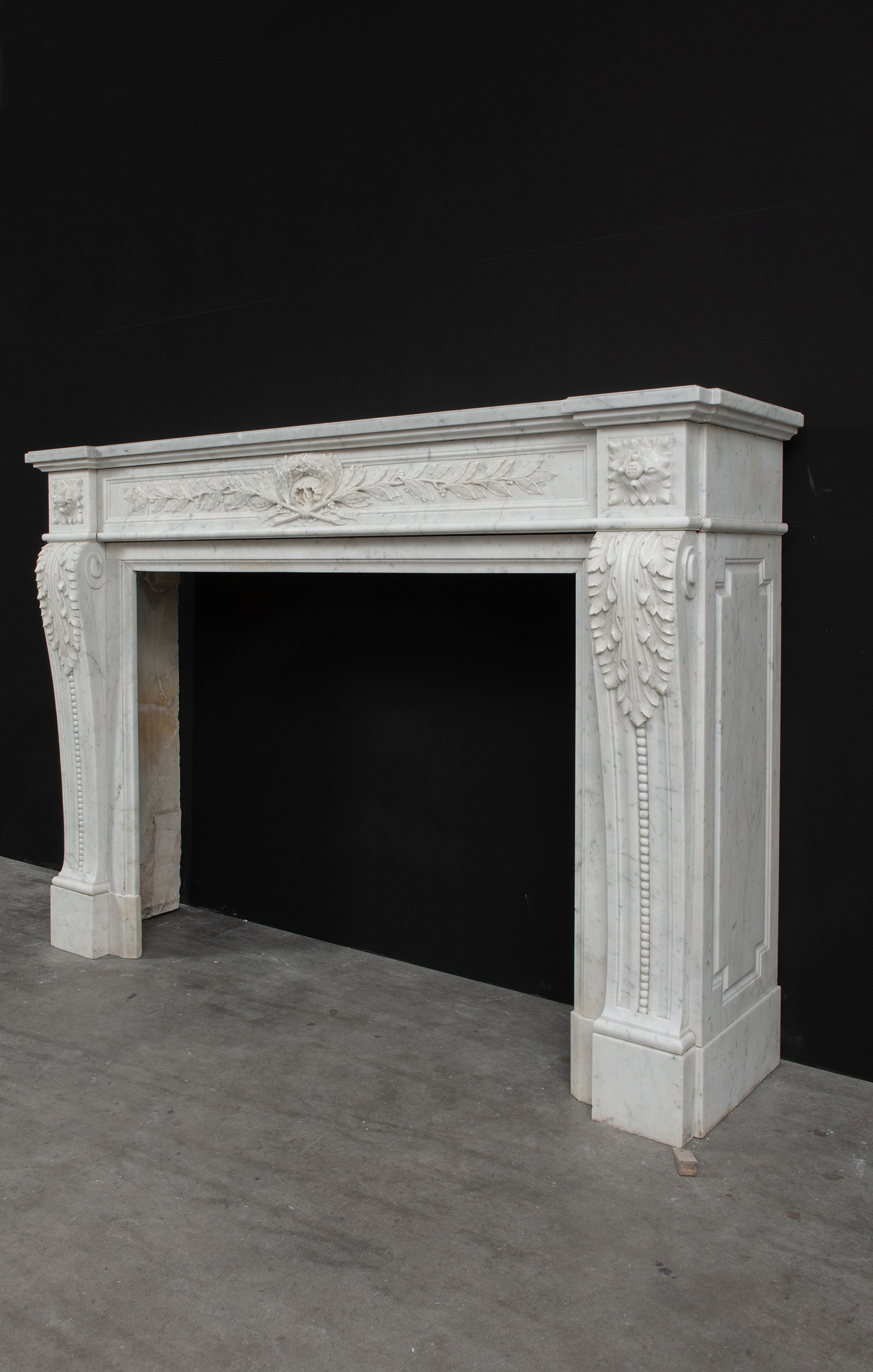 French Antique Louis XVI fireplace mantel in white carrara marble.