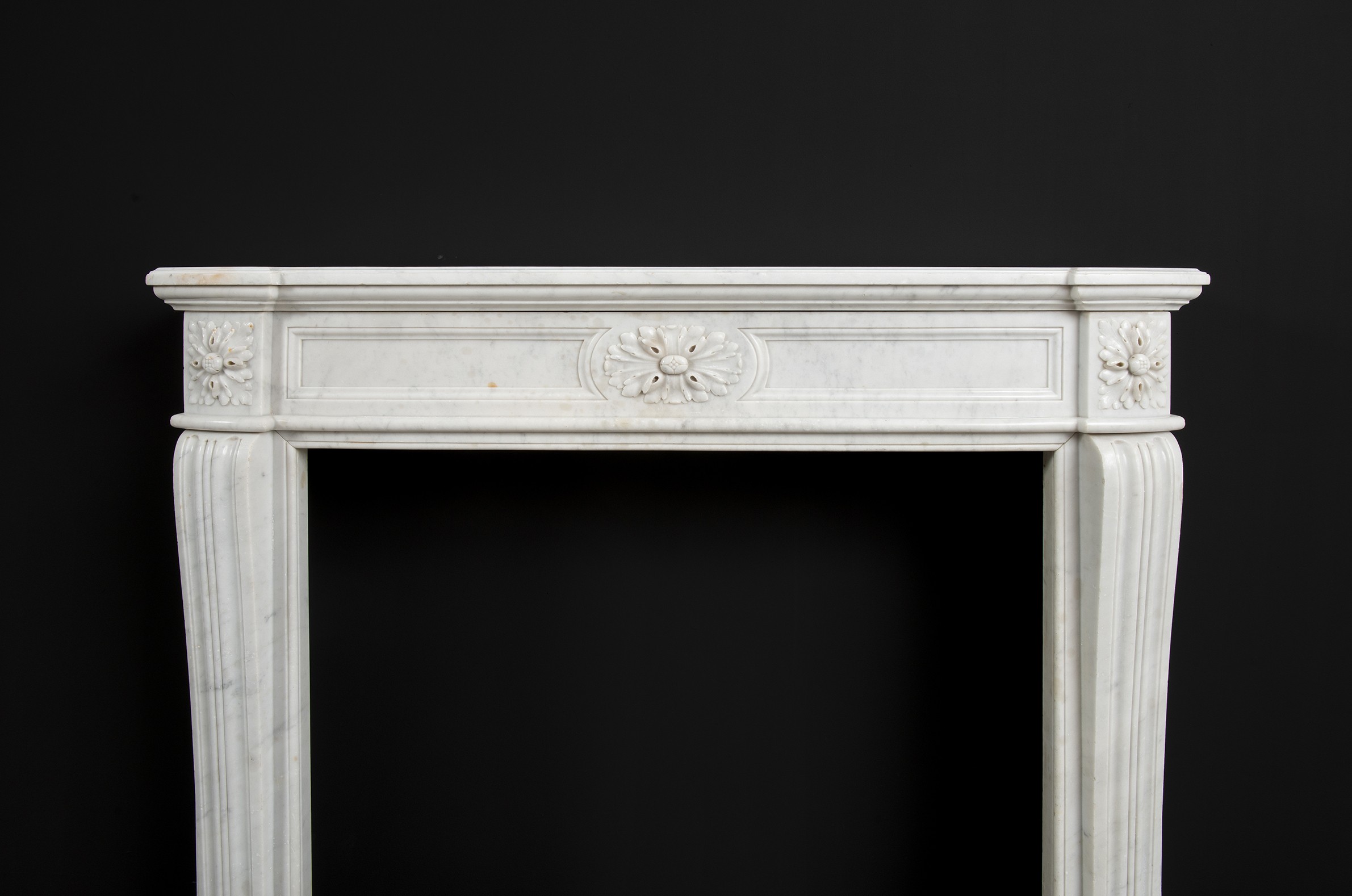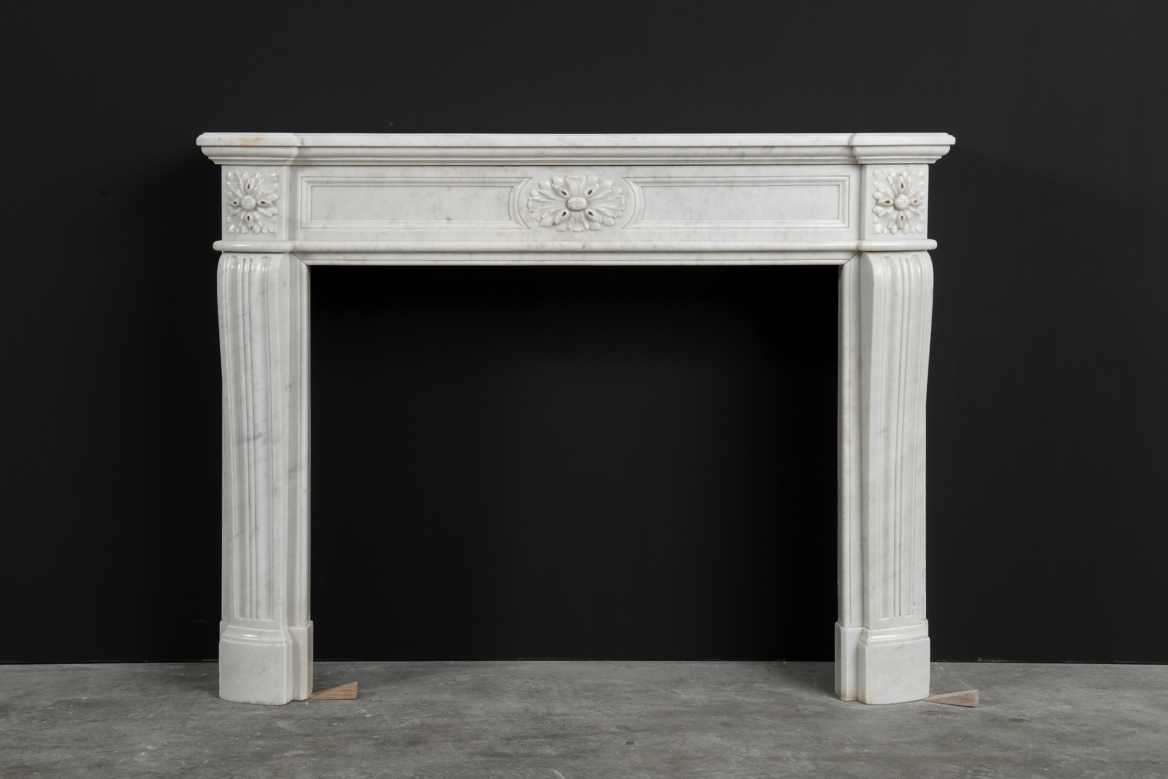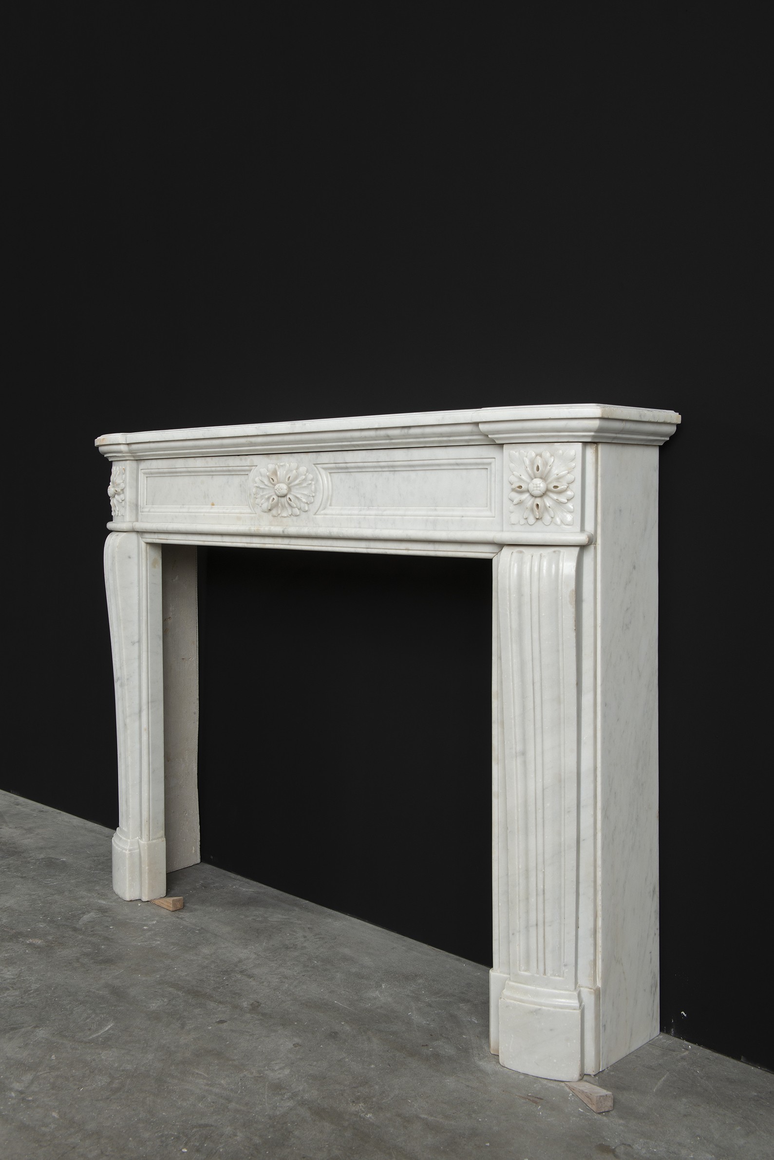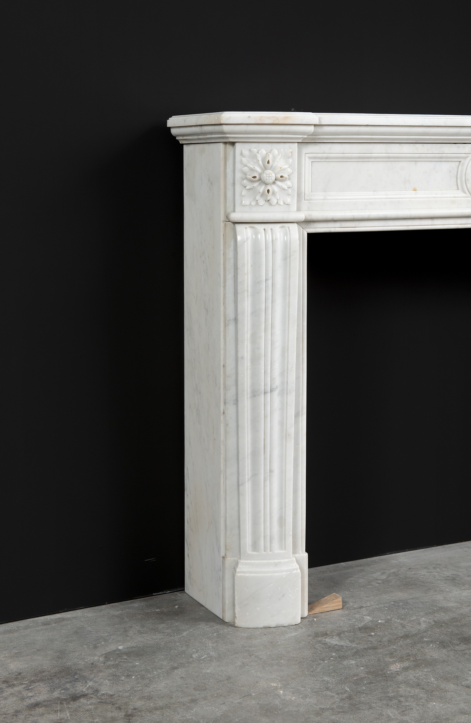 Very exited to offer this unique little gem, perfect proportioned French Louis XVI fireplace mantel in beautiful Carrara white marble.